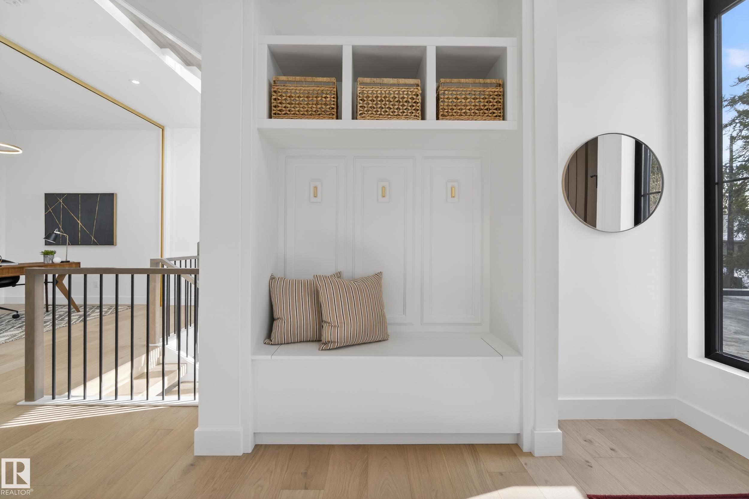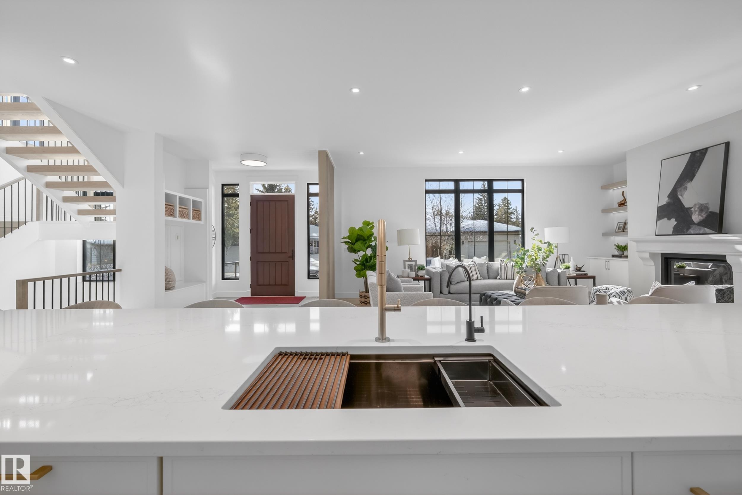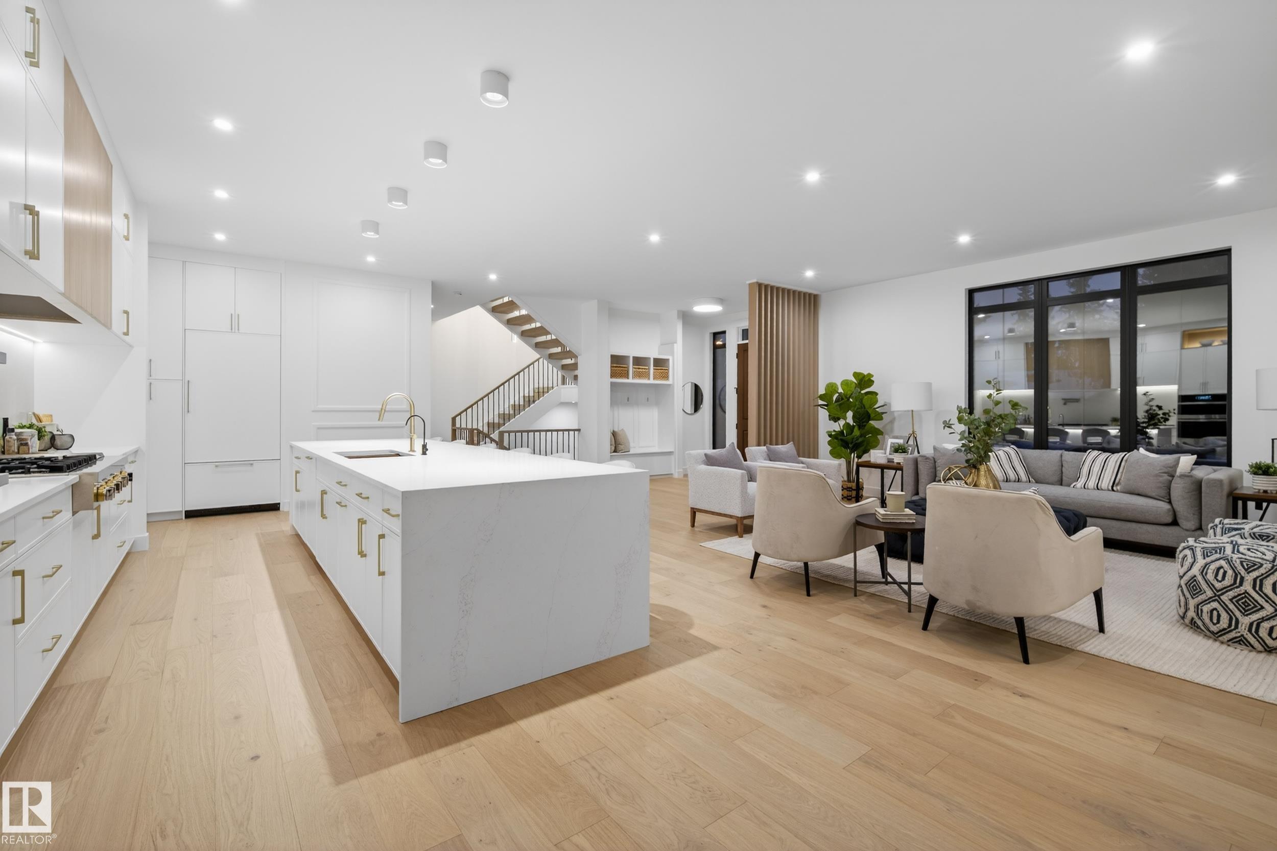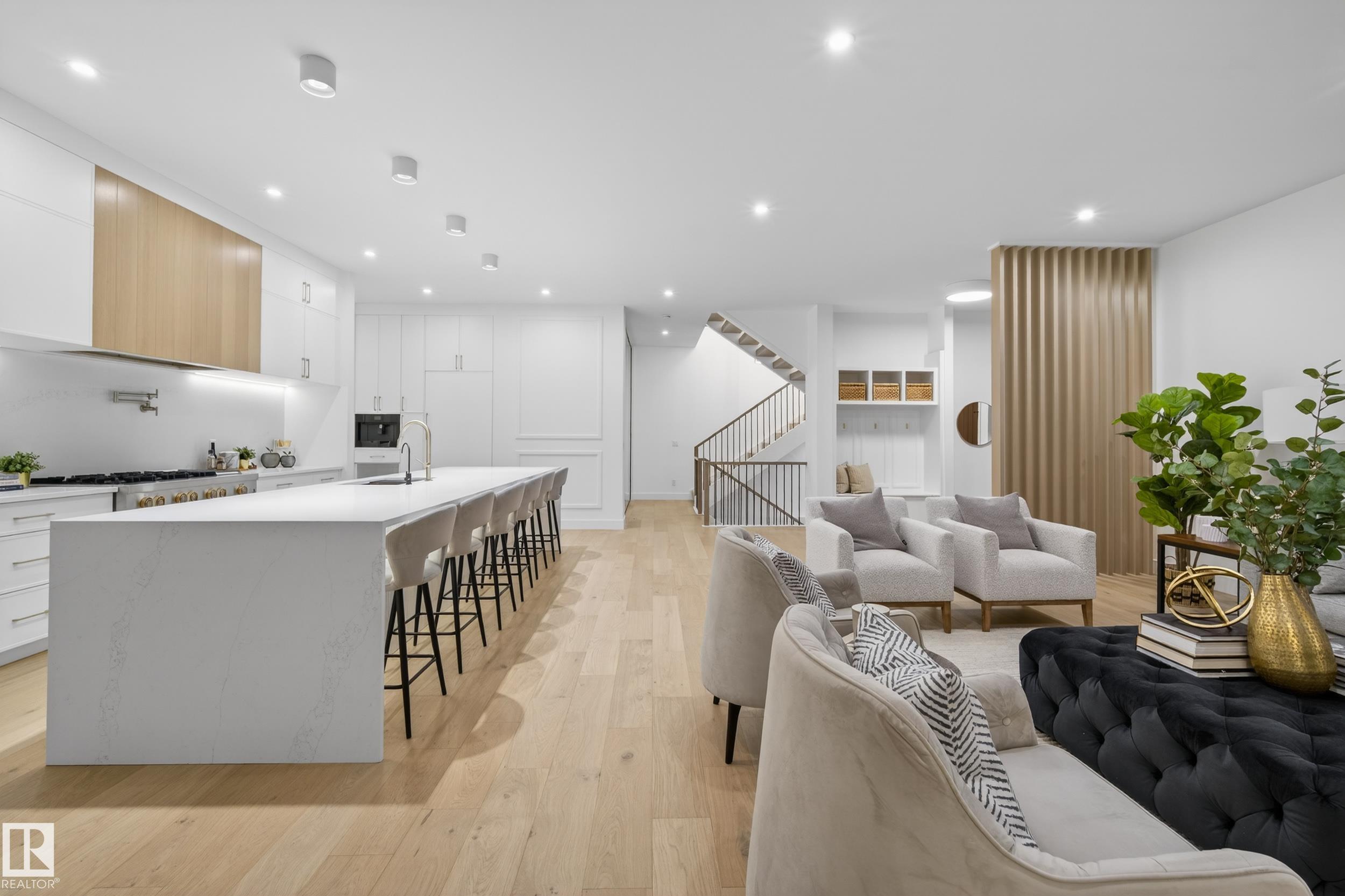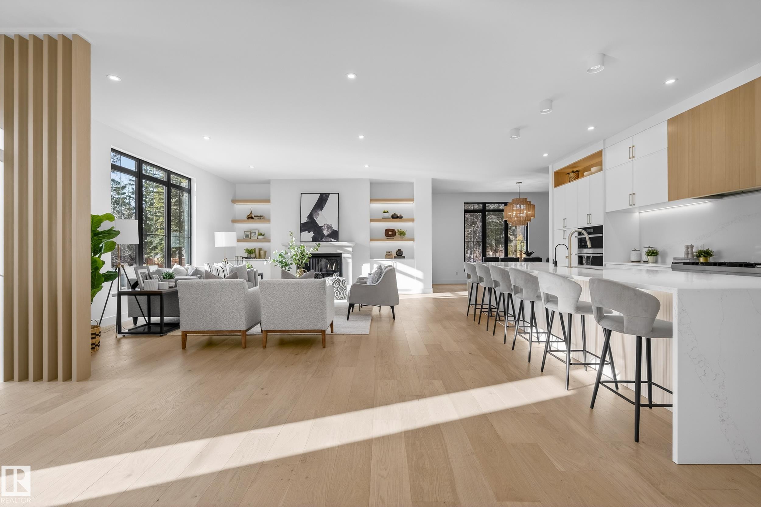 Architecturally striking luxury residence by Evolution Custom Homes showcasing refined design and exceptional craftsmanship throughout. Dramatic 10 ft ceilings, an open rise feature staircase, solid core 8 ft doors, drywall window returns and a statement 48 inch gas fireplace create an elevated main living experience. The chef’s kitchen features white oak custom cabinetry, a premium JennAir and Miele integrated appliance package, a 14 ft dual waterfall island, full height quartz backsplash, butler’s pantry ...