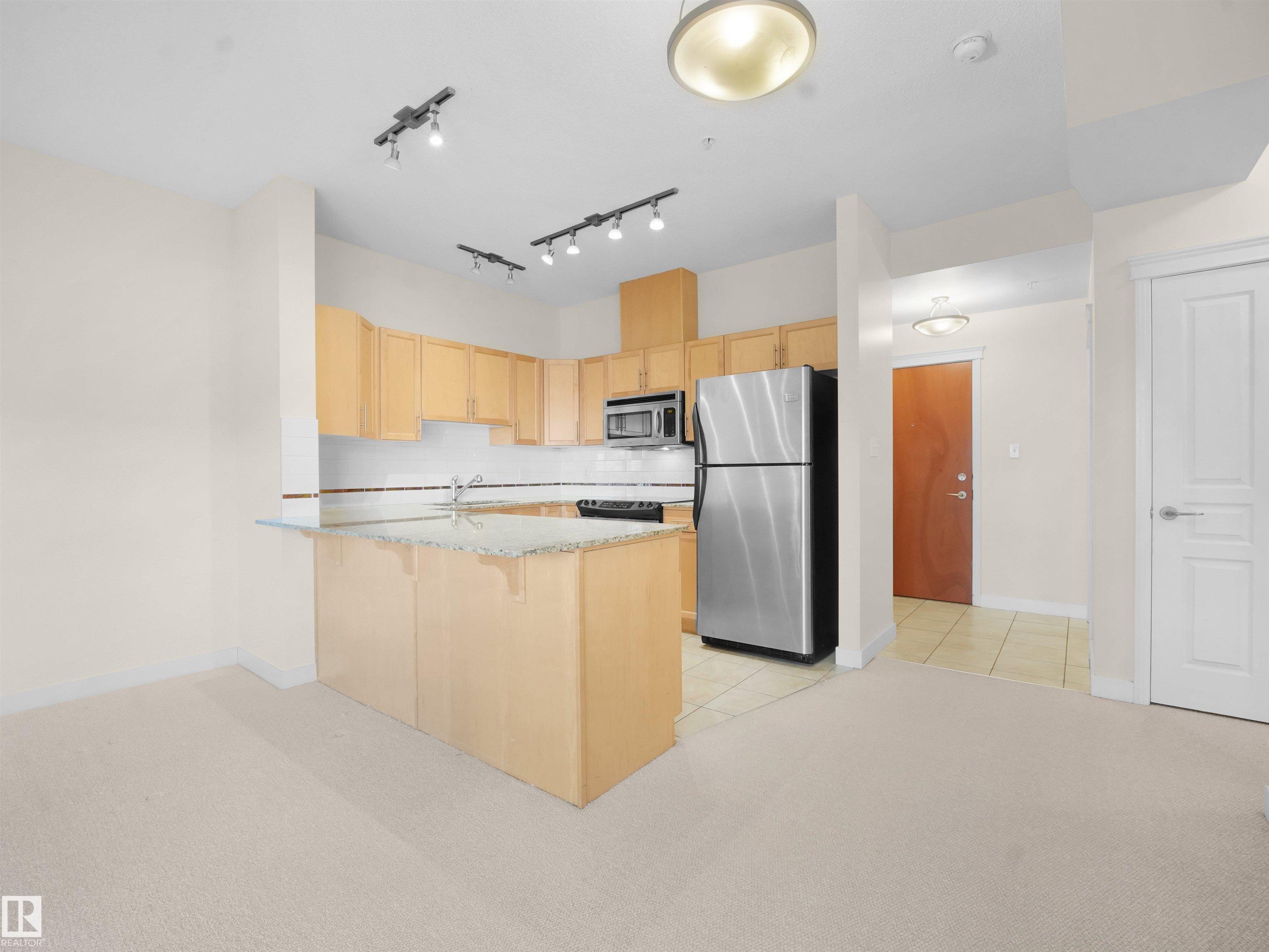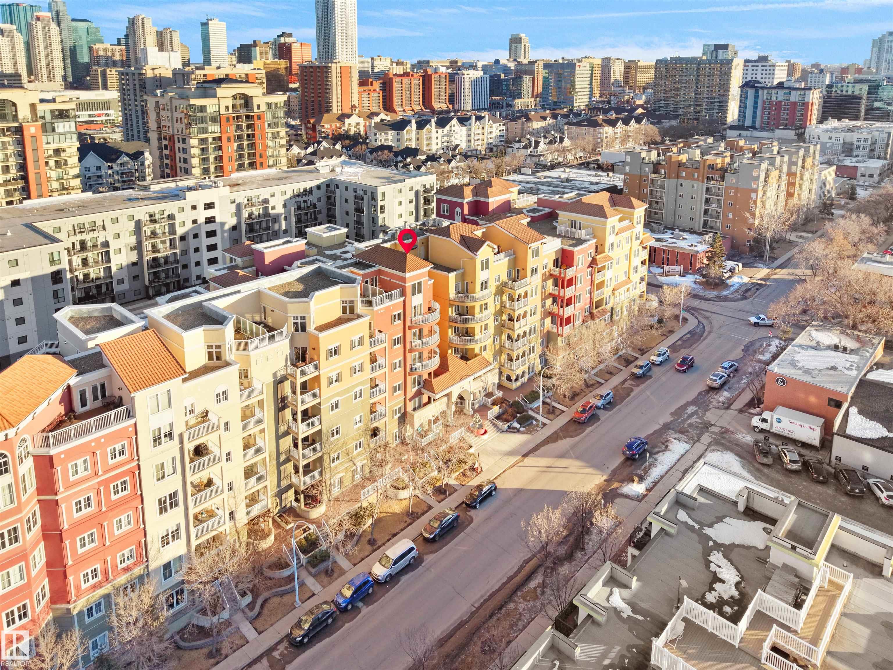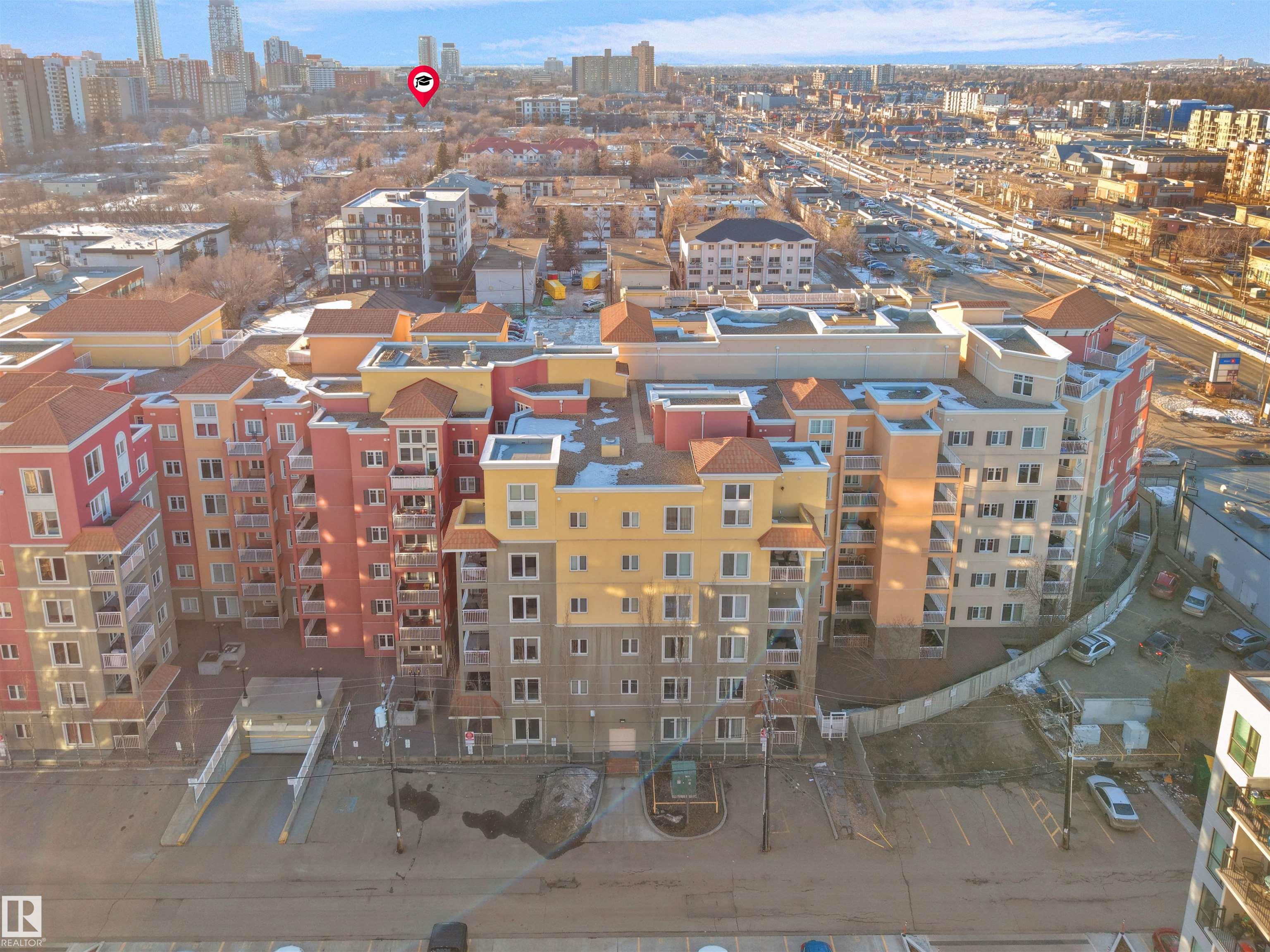 Welcome to one of Edmonton's most desirable buildings, THE VENETIAN. This attractive unit offers 1 Bed/1 Bath + DEN, 9' ceilings, A/C, TITLED PARKING & BALCONY. The Venetian is a CONCRETE and STEEL built complex, which provides great SOUND PROOFING. Enjoy a U-shaped kitchen with eat up bar, S/S appliances & GRANITE COUNTERTOPS. Kitchen over looks a sizable living room with a warming GAS FIREPLACE. Sliding glass doors provide access to balcony . Primary suite features a walk-in closet. Finishing off this uni...